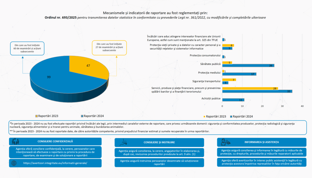Conform datelor transmise de către autoritățile competente, canale externe de raportare, în perioada 1 ianuarie – 31 decembrie 2024 au fost înregistrate 99 de raportări externe, dintre care 83 au fost nominale, iar 16 anonime, în creștere cu aproximativ 110% față de nivelul anului 2023, când au fost înregistrate 47 de raportări externe, dintre care 37 au fost nominale și 10 anonime.